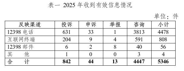 按反映渠道分类,12398电话4478件,占比83.76%;12398互联网终端808件,占比15.11%;12398邮件56件,占比1.06%;其他4件,占比0.07%。(2025收到有效信息情况见表一)