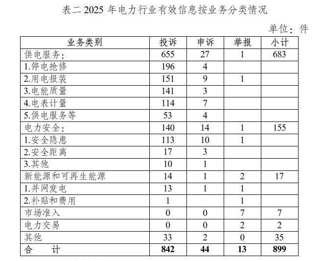 投诉、申诉和举报主要集中在电力行业,共899件。从业务分类情况看,供电服务方面683件,占比75.97%;电力安全方面155件,占比17.24%;新能源和可再生能源方面17件,占比1.89%;市场准入方面7件,占比0.78%;电力交易方面2件,占比0.22%;其他方面35件,占比3.90%。(2025年电力行业有效信息按业务分类情况见表二)。