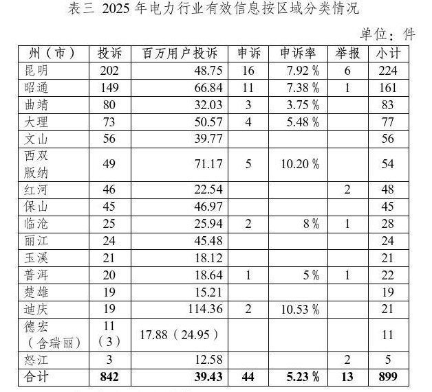 从分布区域来看,投诉主要发生在昆明、昭通、曲靖和大理,共计占比59.86%;百万用户投诉,迪庆、西双版纳、昭通和大理排名靠前;申诉主要发生在昆明和昭通,共计占比61.36%;举报主要发生在昆明,占比46.15%。(2025年电力行业有效信息按区域分类情况见表三)